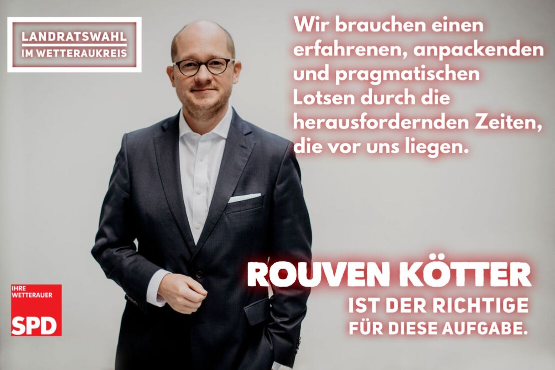 Die Wetterauer SPD-Vorsitzende und Landtagsabgeordnete Lisa Gnadl verweist auf Kötters regionale und europäische Arbeit in den letzten Jahren: „Als Erster Beigeordneter im Regionalverband FrankfurtRheinMain hat Rouven Kötter überregionale Netzwerke geknüpft und sich auf europäischer Ebene für unsere Region stark gemacht. Bereits jetzt hat seine Arbeit im Regionalverband dem Wetteraukreis und seinen Kommunen durchaus genutzt. Von diesen Erfahrungen, Kontakten und Netzwerken könnte der Wetteraukreis jedoch noch erheblich mehr profitieren, wenn Rouven Kötter zum Landrat gewählt würde.“