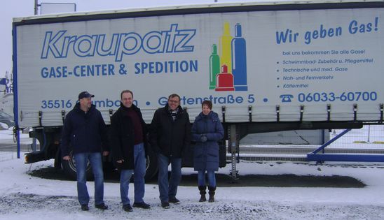(HV). … war kürzlich der SPD-Bürgermeisterkandidat Michael Brückel und besuchte die Gambacher Firma Gase-Kraupatz im Gewerbegebiet am Kreisel. Anette und Ulrich Kraupatz stellten dem Kommunalpolitiker ihr Unternehmen vor, das mittlerweile bundesweit tätig ist und gerne weiter wachsen würde. Insgesamt 30 Mitarbeiterinnen und Mitarbeiter, überwie-gend aus der Region, haben sich auf den Transport von Gefahrengut spezialisiert. Beein-druckt war die SPD-Delegation, zu der auch SPD-Chef Manfred Tschertner und Stadtverord-neter Ernst-Peter Wirth aus Trais gehörten, vom hohen Sicherheitsniveau des Unterneh-mens.