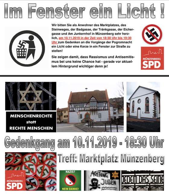 Sich erinnern heißt auch: Sich wappnen vor der Wiederholung vergangener Fehler! Und genau das wollen bestimmte politische Strömungen heutzutage nicht mehr und fordern stattdessen eine "radikale Umkehr" der etablierten Erinnerungskultur an die Pogromnacht 1938 und ihren Folgen. Man spricht bei wichtigen Denkmalen mittlerweile von „Schandmalen“ und anderen Herabsetzungen und Despektierlichkeiten. Wohin es führt, wenn politisch Verblendete und Radikale freie Hand haben, konnte die entsetzte Bevölkerung jüngst in Halle erleben – dies ist nur ein weiteres trauriges und mahnendes Beispiel von vielen. Aus diesem aktuellen Anlass und auch in Wahrung genau jener bei den Rechten so verhassten Erinnerungskultur an die Pogromnacht wird der SPD-Ortsverein Münzenberg am Sonntag, dem 10.11.2019, ab 18:30 Uhr auf dem Marktplatz in Münzenberg einen kleinen und stillen Gedenkgang durch Gassen der Münzenberger Altstadt durchführen. Der Weg führt vom Marktplatz über den Steinweg, die Badgasse, Tränkgasse und Eichergasse zur Alten Synagoge, wo als Abschluss ein Statement der Münzenberger Sozialdemokraten gehalten wird. Gerade das Erstarken von rechtslastigen und rechtsextremen Ansichten im politischen und gesellschaftlichen Alltag verleiht dieser Veranstaltung großes und aktuelles Gewicht. „Ein Licht im Fenster“ ist ein stilles, aber sichtbares Zeichen von Menschen in Münzenberg gegen Hass, Fremdenfeindlichkeit und Antisemitismus! Alle Menschen sind eingeladen, sich gemensam auf den Weg durch die Münzenberger Altstadt zu machen und sich an den vielen Lichter in den Fenstern zu erfreuen in der Gewissheit, dass Hass, Rassismus und Ausgrenzung in Münzenberg keinen Platz haben!